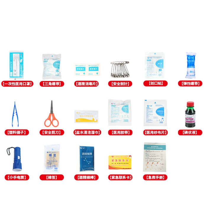 酒精棉棒*5 清洁湿巾*2 碘伏消毒液*1 棉签20支*1 酒精棉片*10 透气创口贴*10 医用纱布片*2 弹性绷带*1 三角绷带*1 剪刀*1 镊子*1 安全别针*10 小手电*1