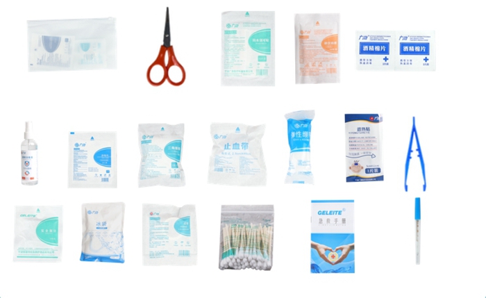 碘伏棉棒10支*1 碘伏消毒液100ml*1 酒精棉片*10 医用棉签50支*1 防水创口贴10片*1 医用纱布片*4 三角绷带*1 弹性绷带*1 止血带*1 辅料剪刀*1 医用透气胶带*1 塑料镊子*1 安全别针*10 冰袋*1 体温计*1 退热贴*1 急救知识手册*1、PE袋*1 10寸铝合金药箱*1