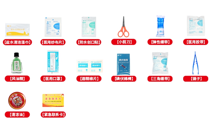 碘伏棉棒*5支 酒精棉片*6片 盐水清洁湿巾*2片 创口贴*10片 纱布片*2片 弹性绷带*1卷 止血带*1卷 三角绷带*1条 剪刀*1把 透气胶带*1卷 清凉油*1只 一次性医用口罩*1个 健康联系卡 急救说明书*1 手提急救包*1个