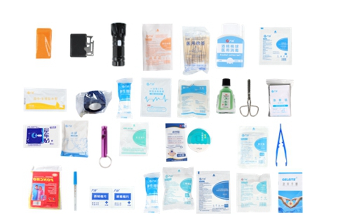 碘伏棉棒10支*1 医用棉签20支*1 酒精棉球25粒*1 酒精消毒片*10 清洁湿巾*4 医用纱布片*5 无菌敷贴*2 自粘绷带*1 弹性绷带(大号)*1 弹性绷带(小号) 卡扣止血带*1 透气创口贴10片*1 三角绷带*1 纱布剪刀*1 医用透气胶带*1 塑料镊子*1 安全别针*10 CPR呼吸膜*1 检查手套*1 保温毯*1 体温计*1 退热贴*2 晕车贴2片*1 冰袋*1 风油精*1 高频救生哨*1 多功能刀*1 压缩毛巾*1小手电筒*1 雨衣 急救识手册*1 急救包*1
