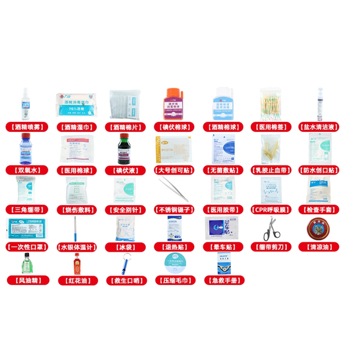 酒精消毒喷雾*1,酒精湿巾*1,酒精棉片*1,碘伏棉球*1,酒精棉球*1,医用棉签*2, 盐水清洁液*2,过氧化氢消毒液*1,医用棉球*1,碘伏消毒液*1,大号创可贴*6,无菌敷贴*5,乳胶止血带*1,防水创口贴*2,三角绷带*1,烧伤敷料*1,安全别针*1,敷料镊子*1,用胶带*1,CPR人工呼吸膜 *1,检查手套*2,医用一次性口罩*10,玻璃体温计,医用冰袋*1,医用退热贴*10,晕车贴*1,绷带剪刀*1,清凉油*1,风油精*1,正红花油*1,救生口哨*1,压缩毛巾*1,急救手册*1,急救包*1